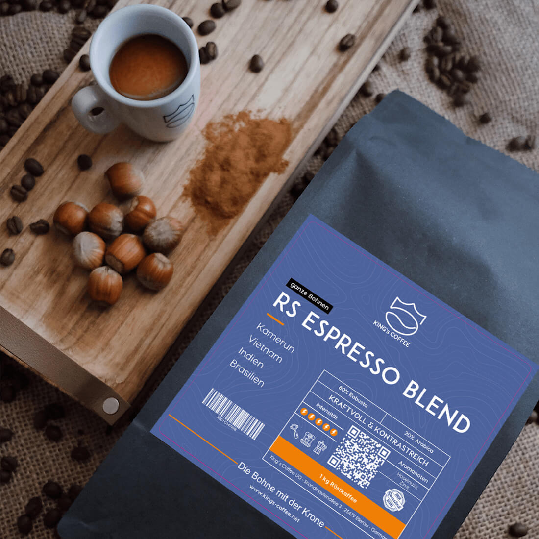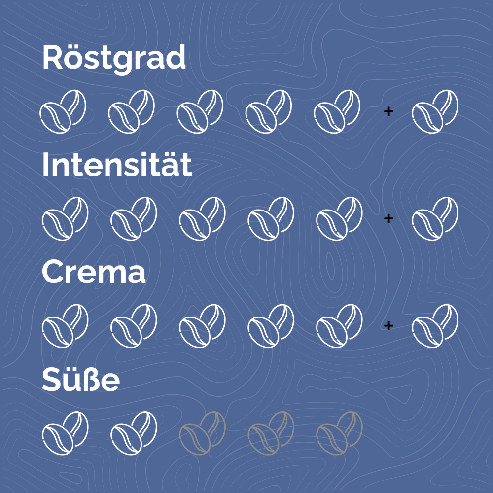Extrem stark, nussig & würzig – mit Noten von Zimt und einer dichten Crema. Maximaler Koffeinschub, säurearm. Für alle, die Leistung lieben.