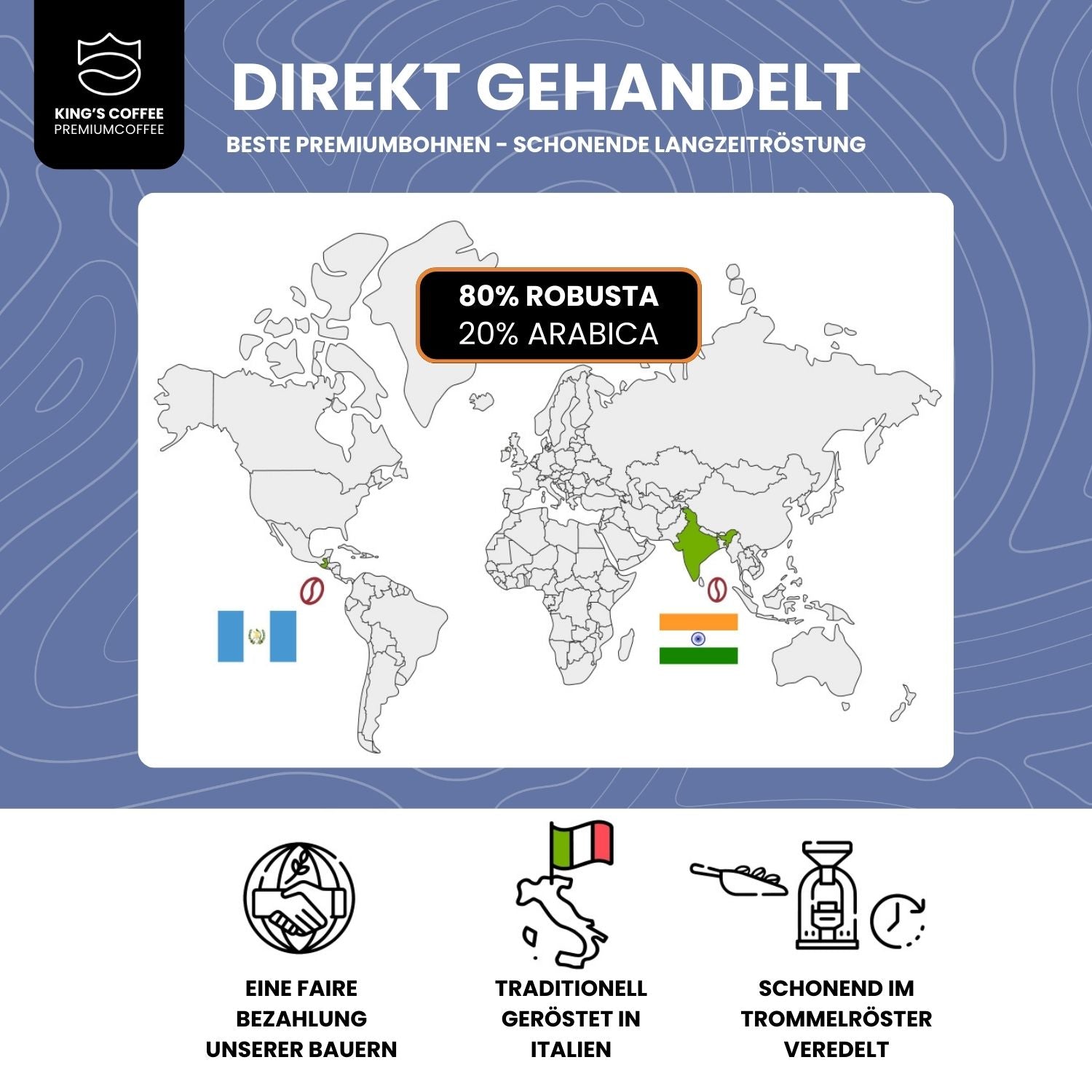 80% Edel-Robusta aus Indien, 20% Arabica aus Mittelamerika – direkt gehandelt, fair bezahlt und ideal für sportliche Höchstleistungen.