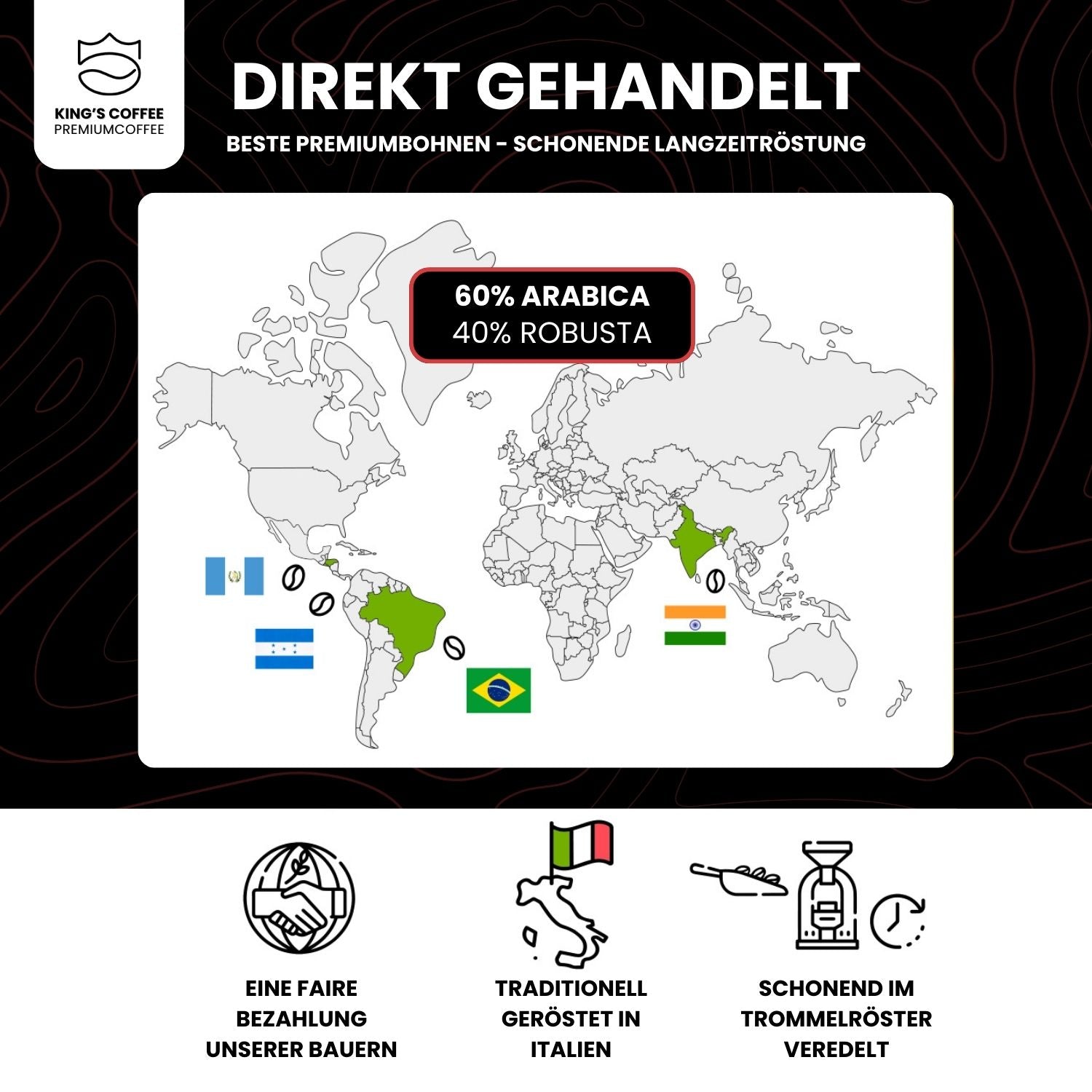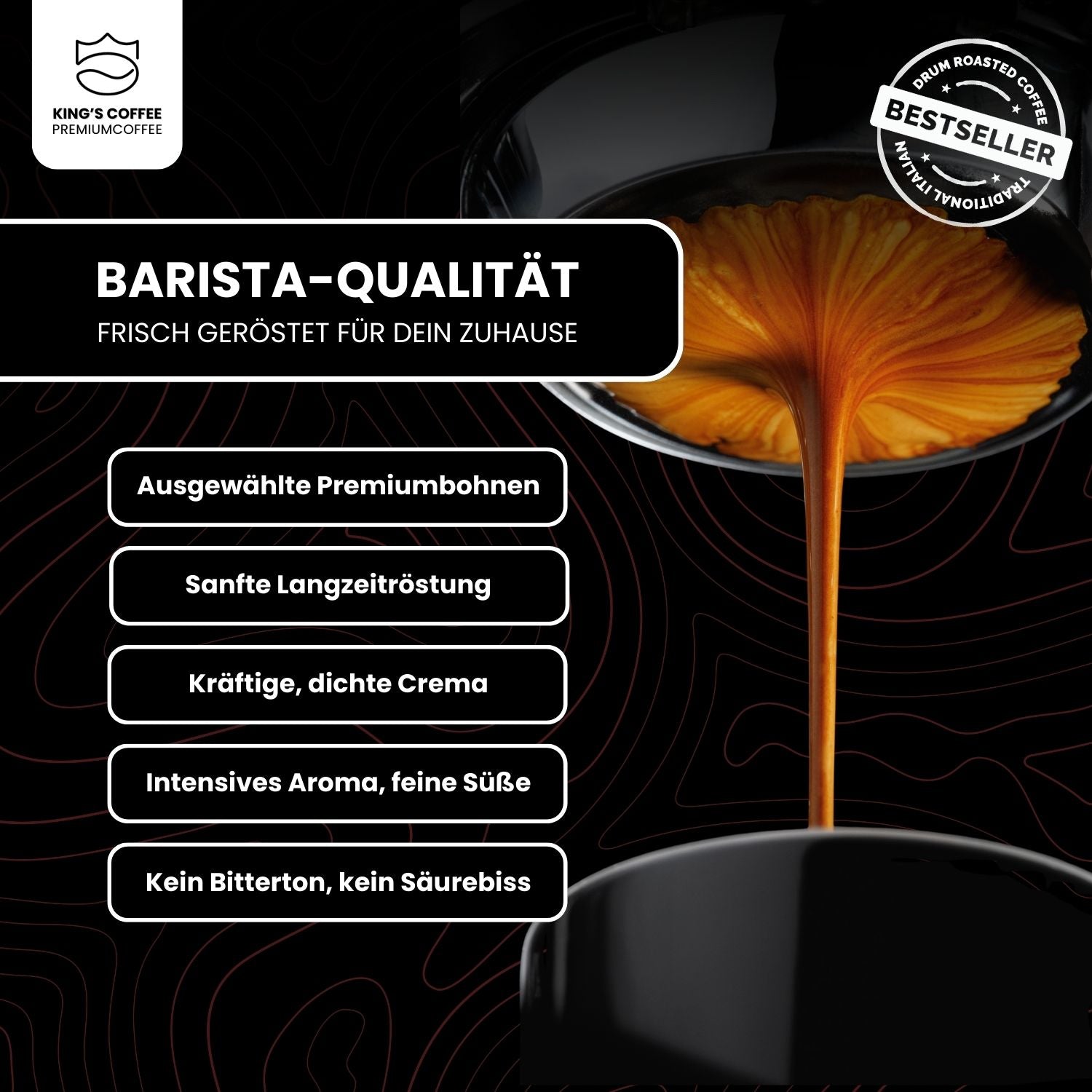 Sorgfältig in kleinen Chargen nach traditioneller italienischer Trommelröstung veredelt und direkt aromasicher verpackt. Die langsame Röstung entfaltet volles Aroma, reduziert Säure und eliminiert Bitterstoffe – für einen besonders harmonischen und bekömmlichen Kaffeegenuss.