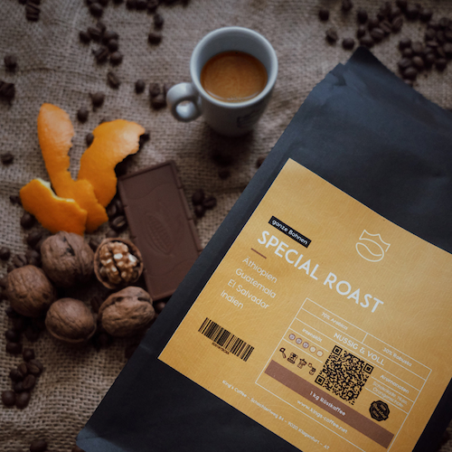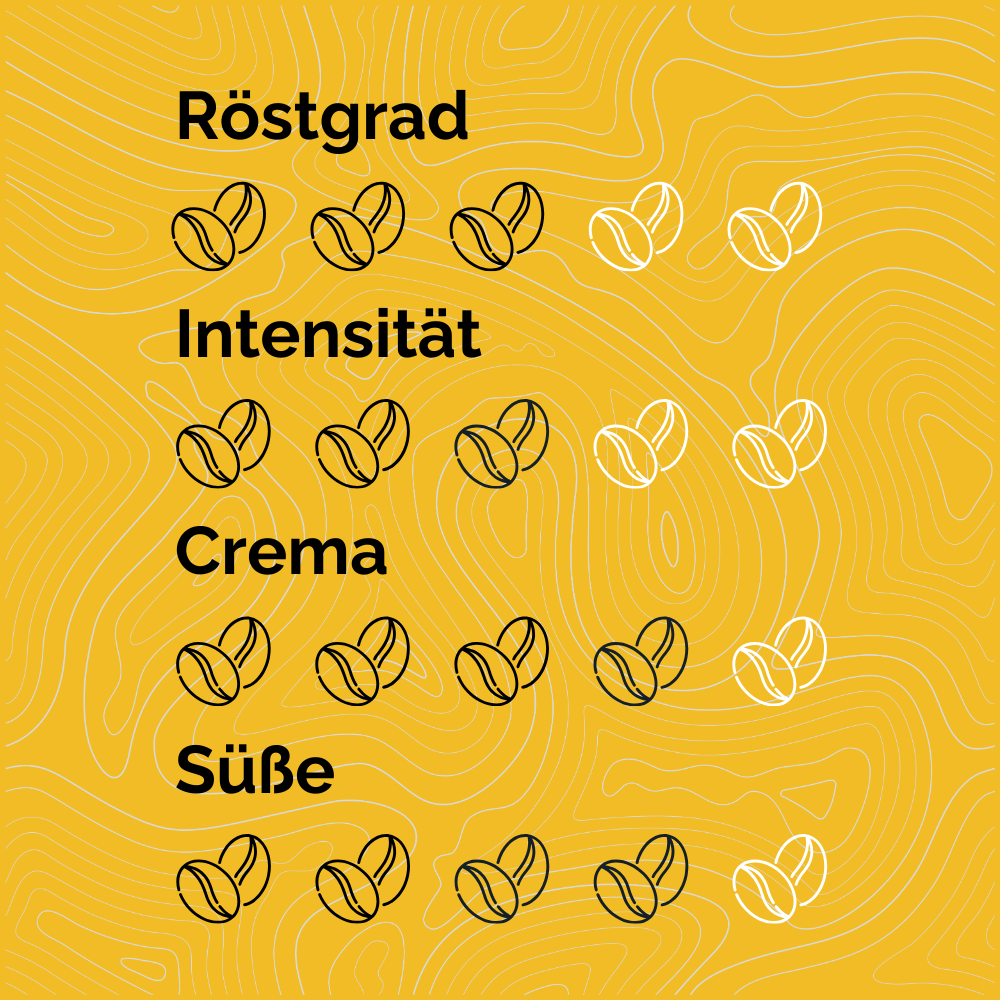 Schokolade, Nuss & feine Orangennoten – vollmundig, mild in der Säure und gekrönt von einer unvergleichlichen Crema. Genuss in Perfektion!