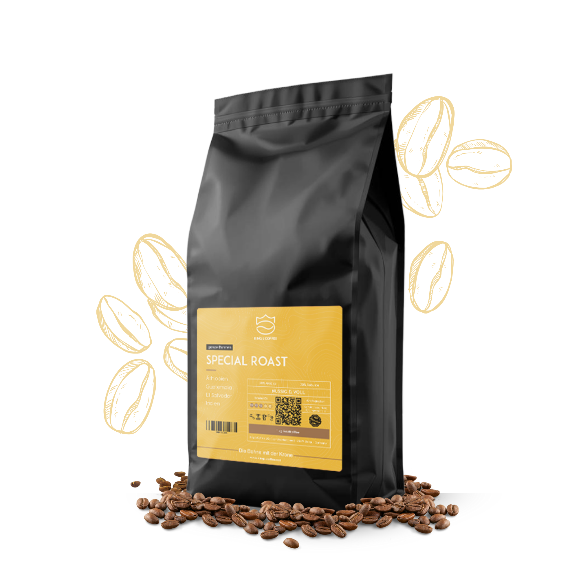 Durch die Mischung aus Arabica aus Äthiopien, Guatemala und El Salvador und einem Edel-Robusta Anteil aus Indien, ist dieser King's Coffee besonders intensiv, nussig und voll.
